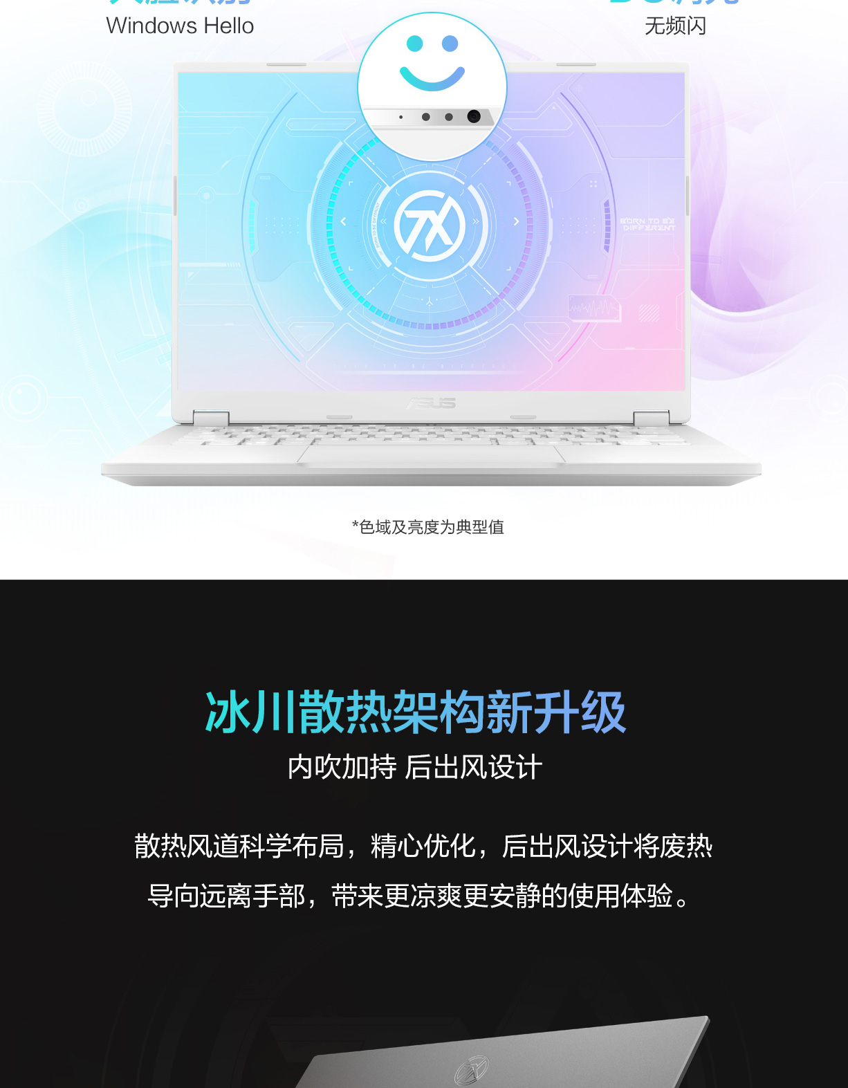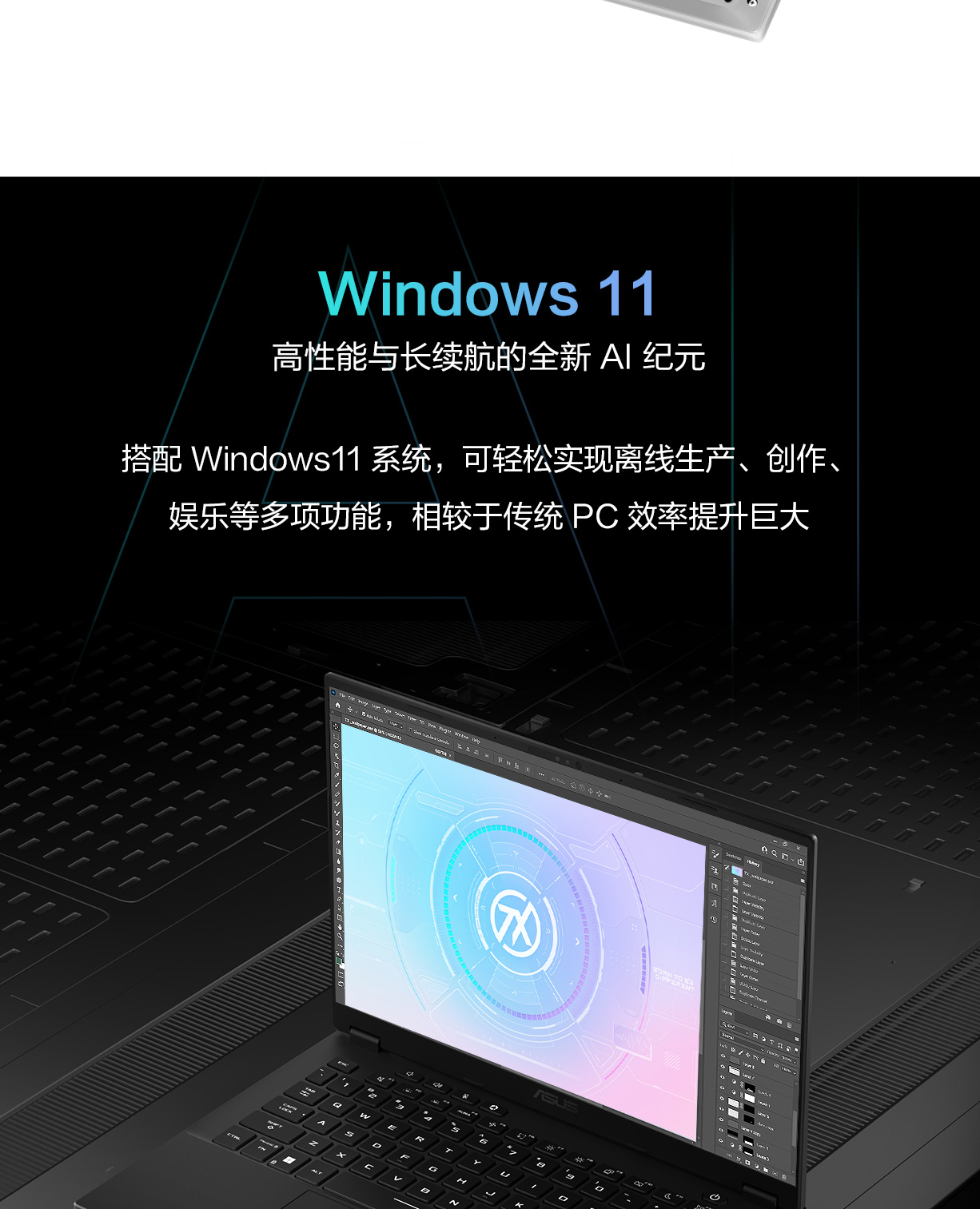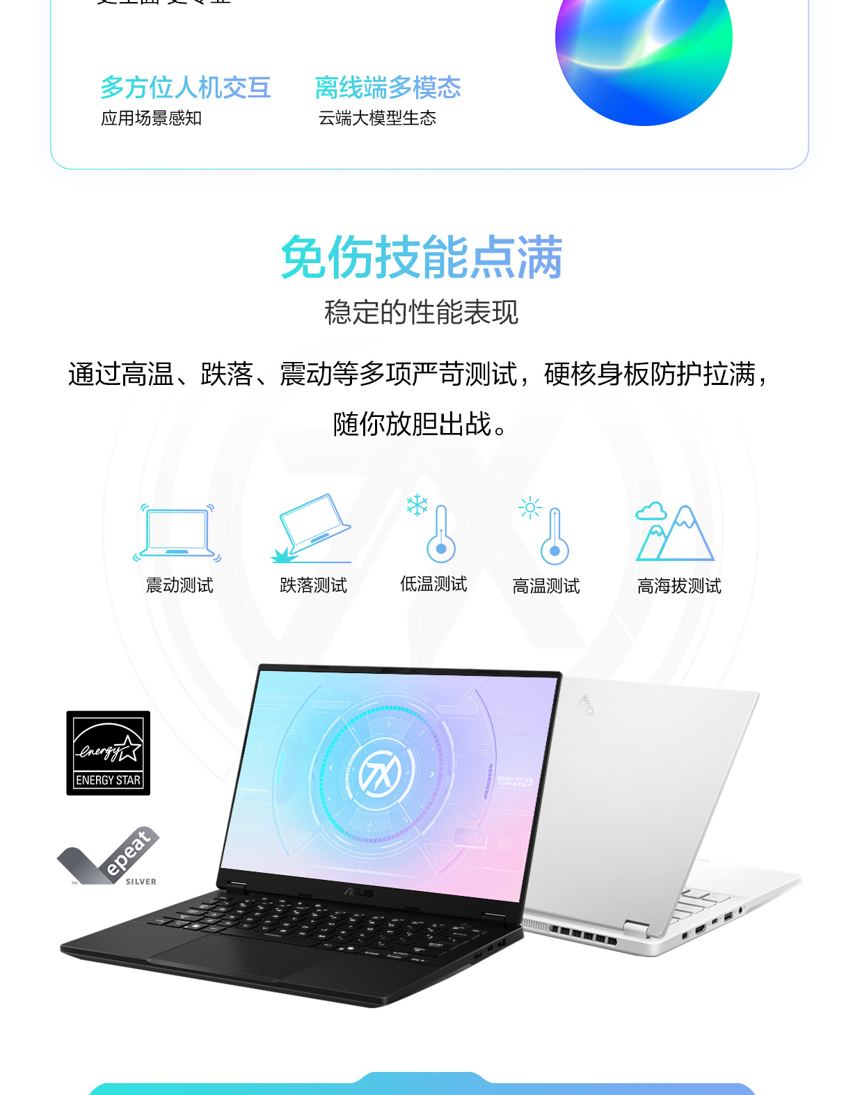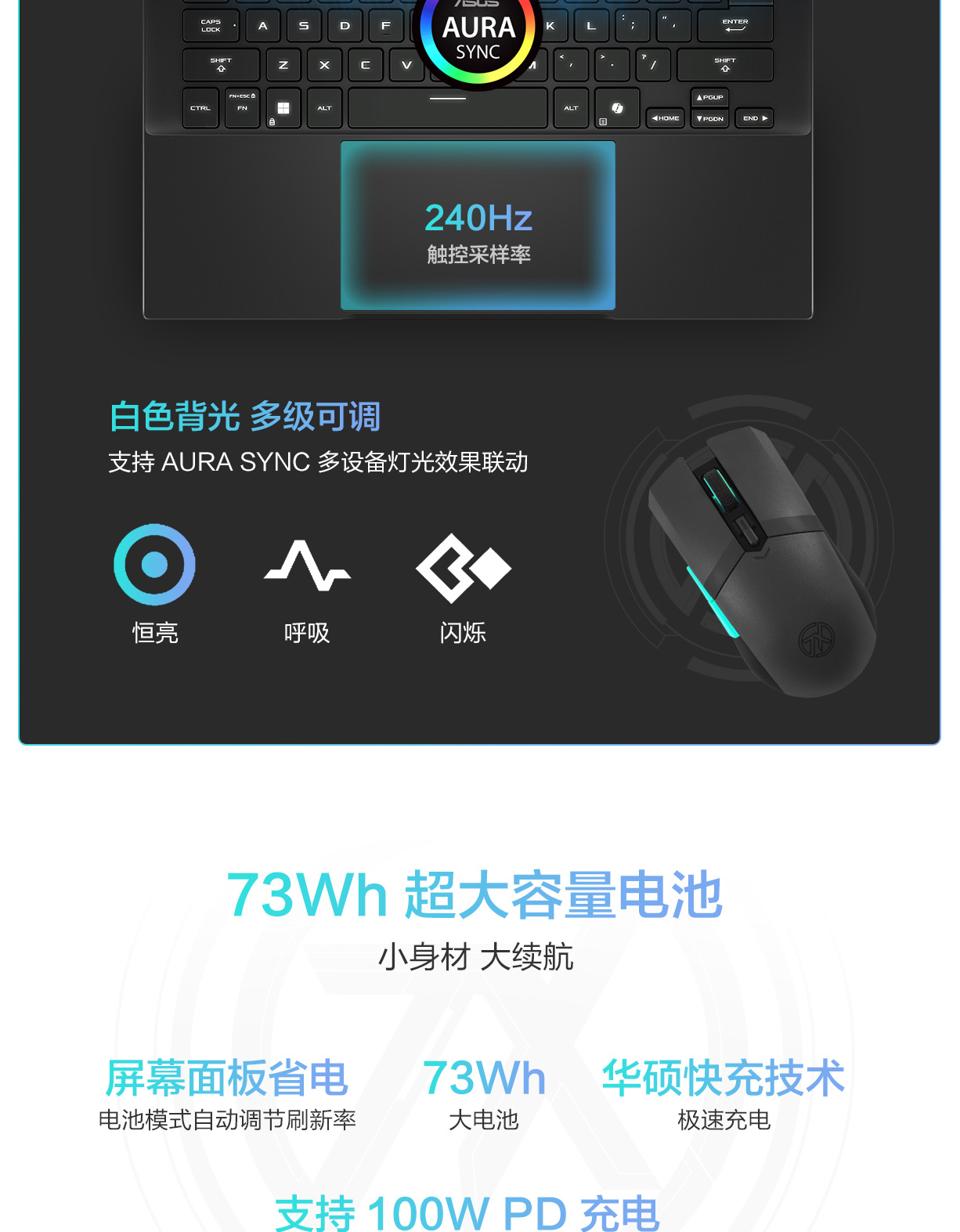 * 标准的华硕电池续航测试环境如下:Windows 操作系统、150尼特亮度的显示模块、灯效关闭及其它应用设置。