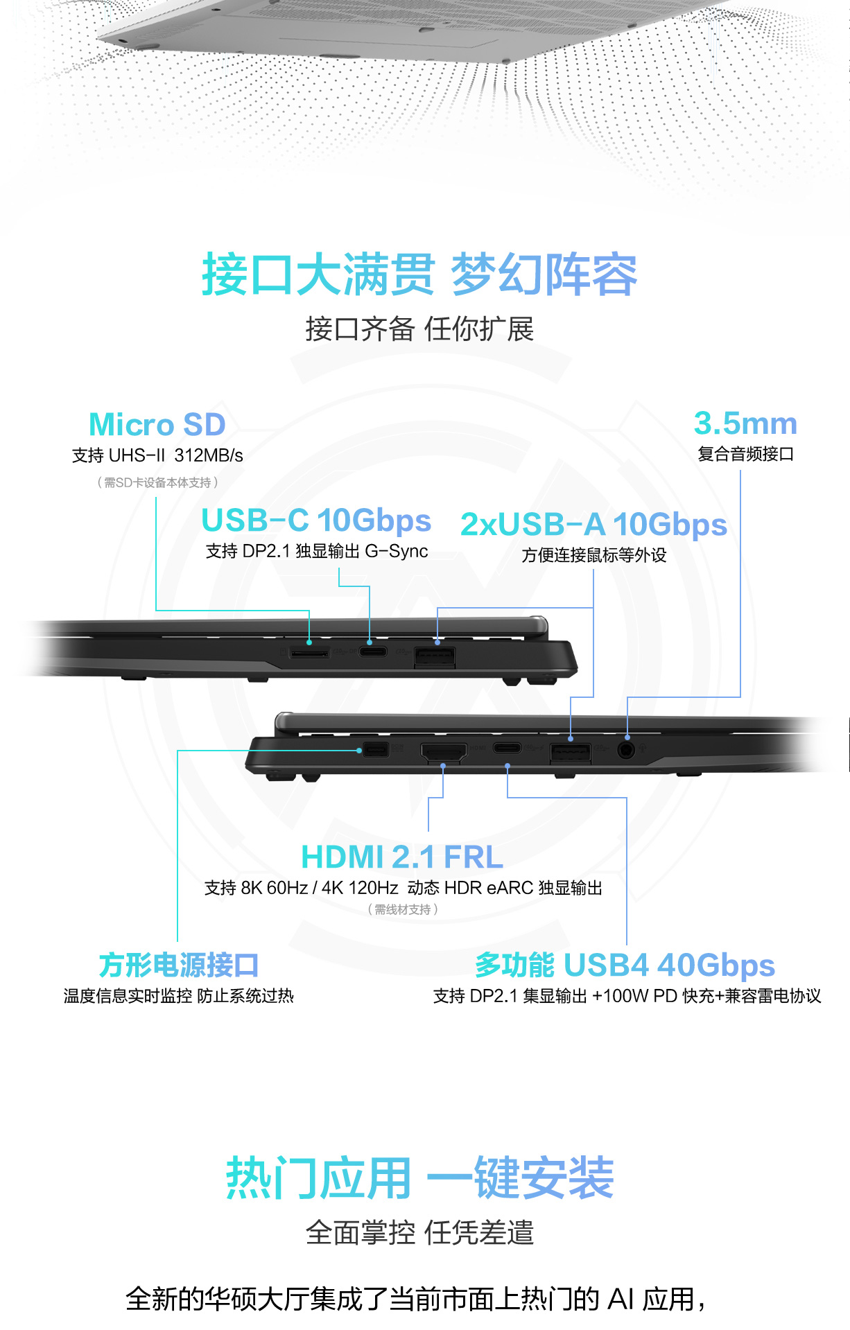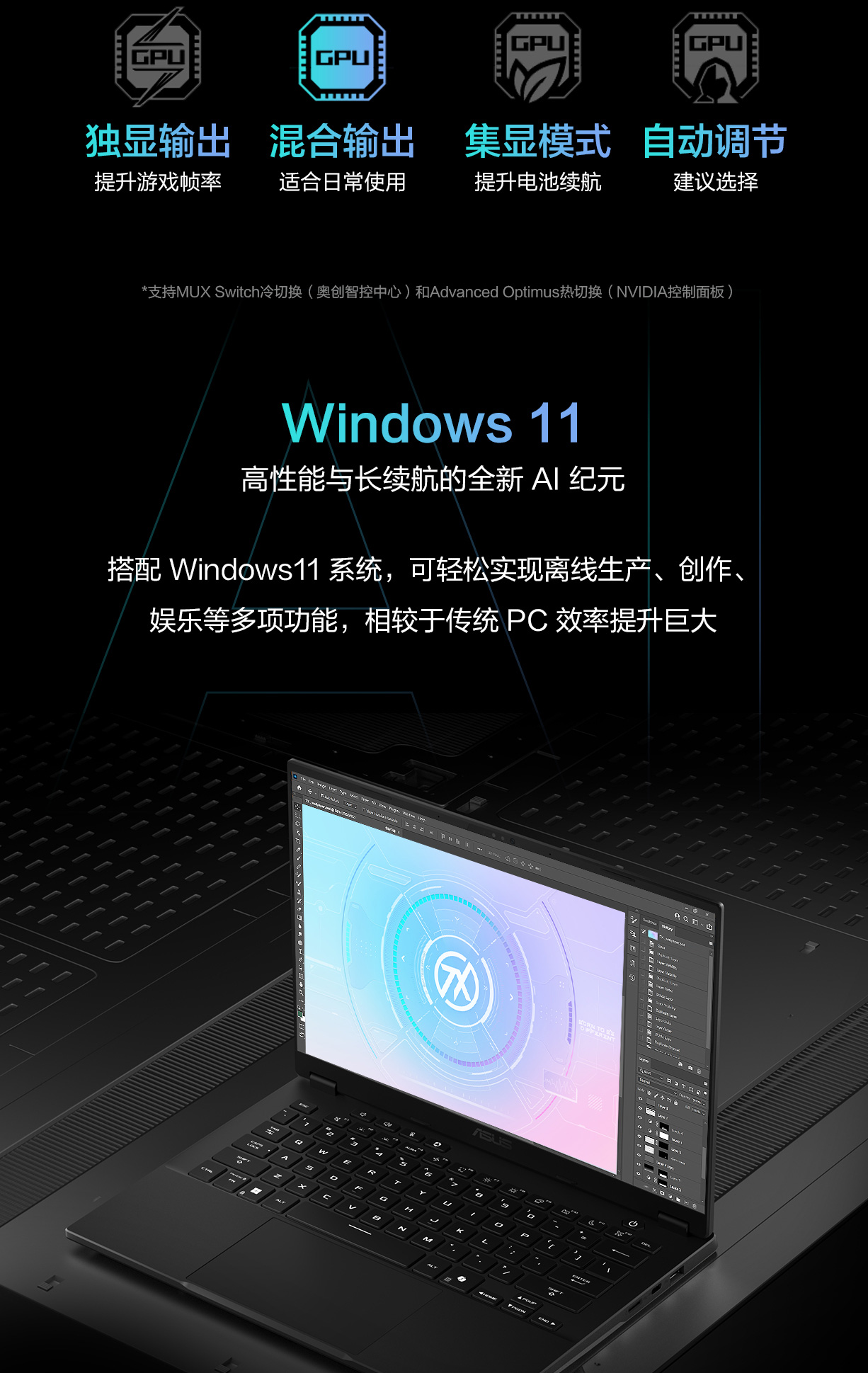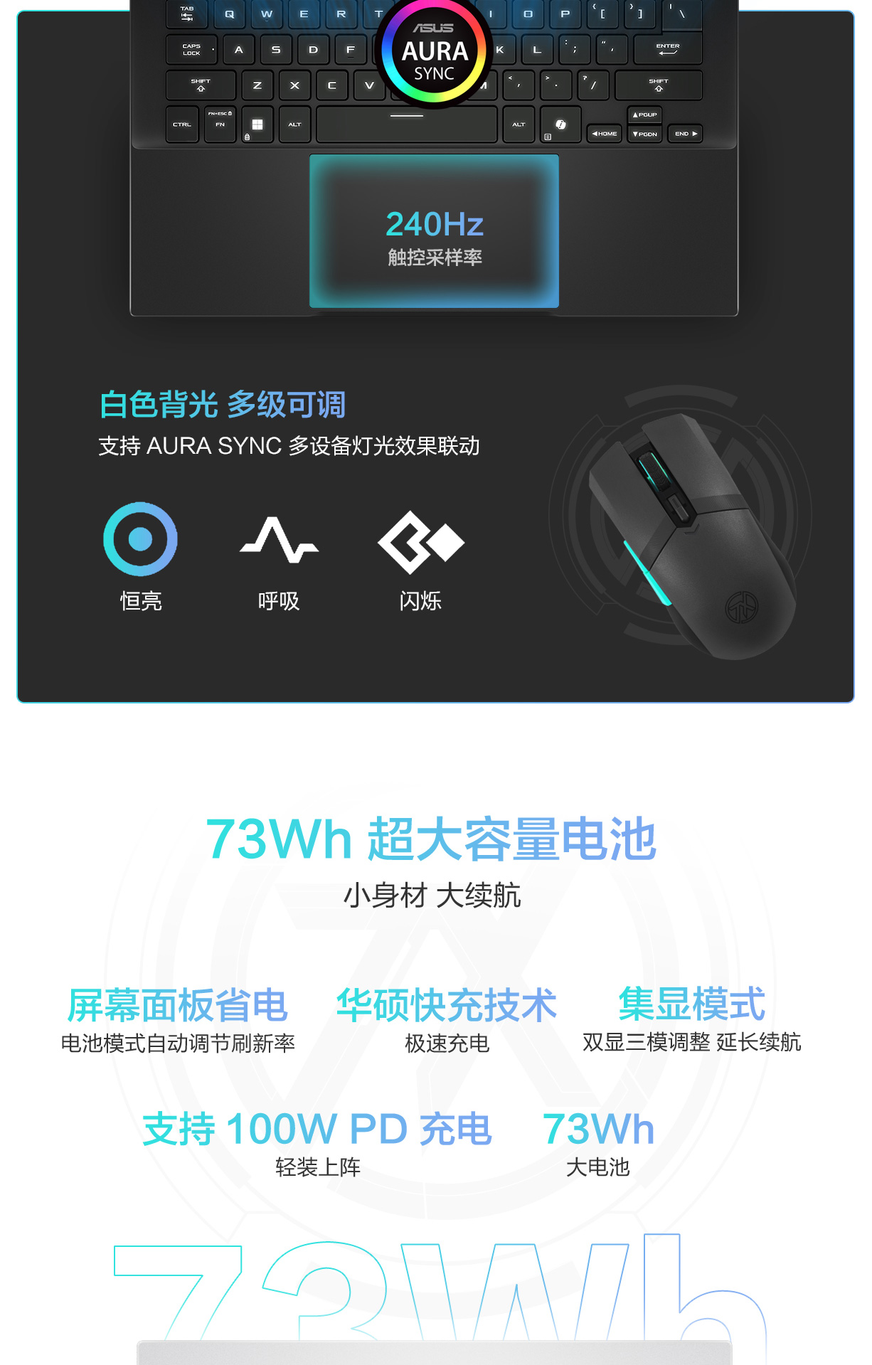 * 标准的华硕电池续航测试环境如下:Windows 操作系统、150尼特亮度的显示模块、灯效关闭及其它应用设置。