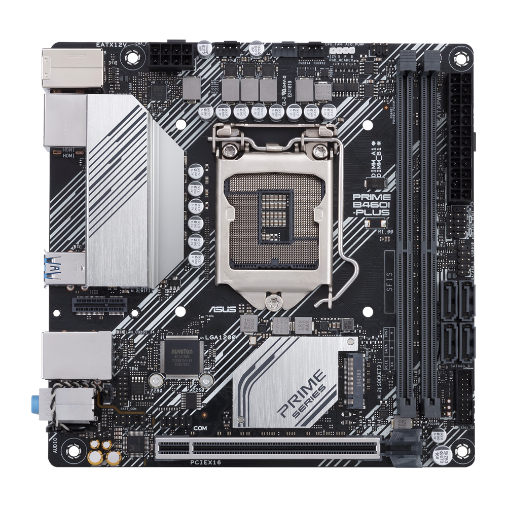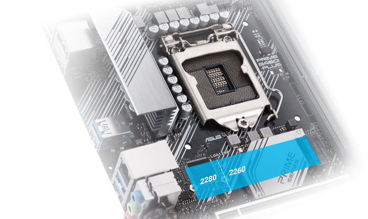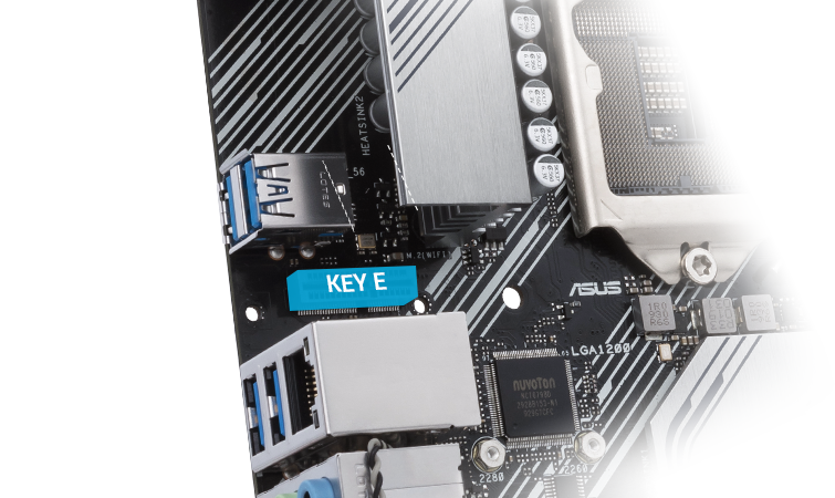 PRIME B460I-PLUS 采用一个垂直的 M.2 (Key E) 插槽和华硕专用的 Wi-Fi 卡支架,让您通过安装 M.2 Wi-Fi/蓝牙模块来灵活地升级您的网络解决方案。