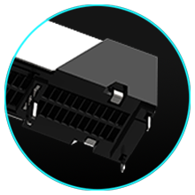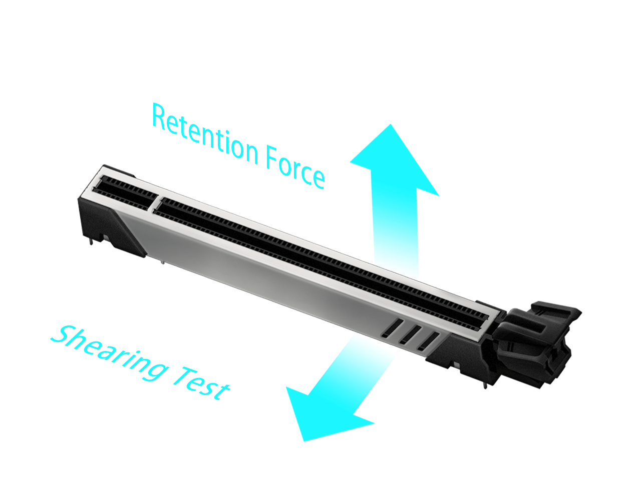 SafeSlot Core+ 高强度安全插槽是华硕特有专利*,采用一次注塑成型技术制造高强度PCIe插槽,提供更强的保持力与剪切阻力。并在插槽外包裹金属强化层以增加其坚固性,通过额外的焊接点坚固地固定于PCB板,保护显卡插槽与显卡不易变形损坏。(*中国实用新型专利 专利号:ZL201620211856.8)