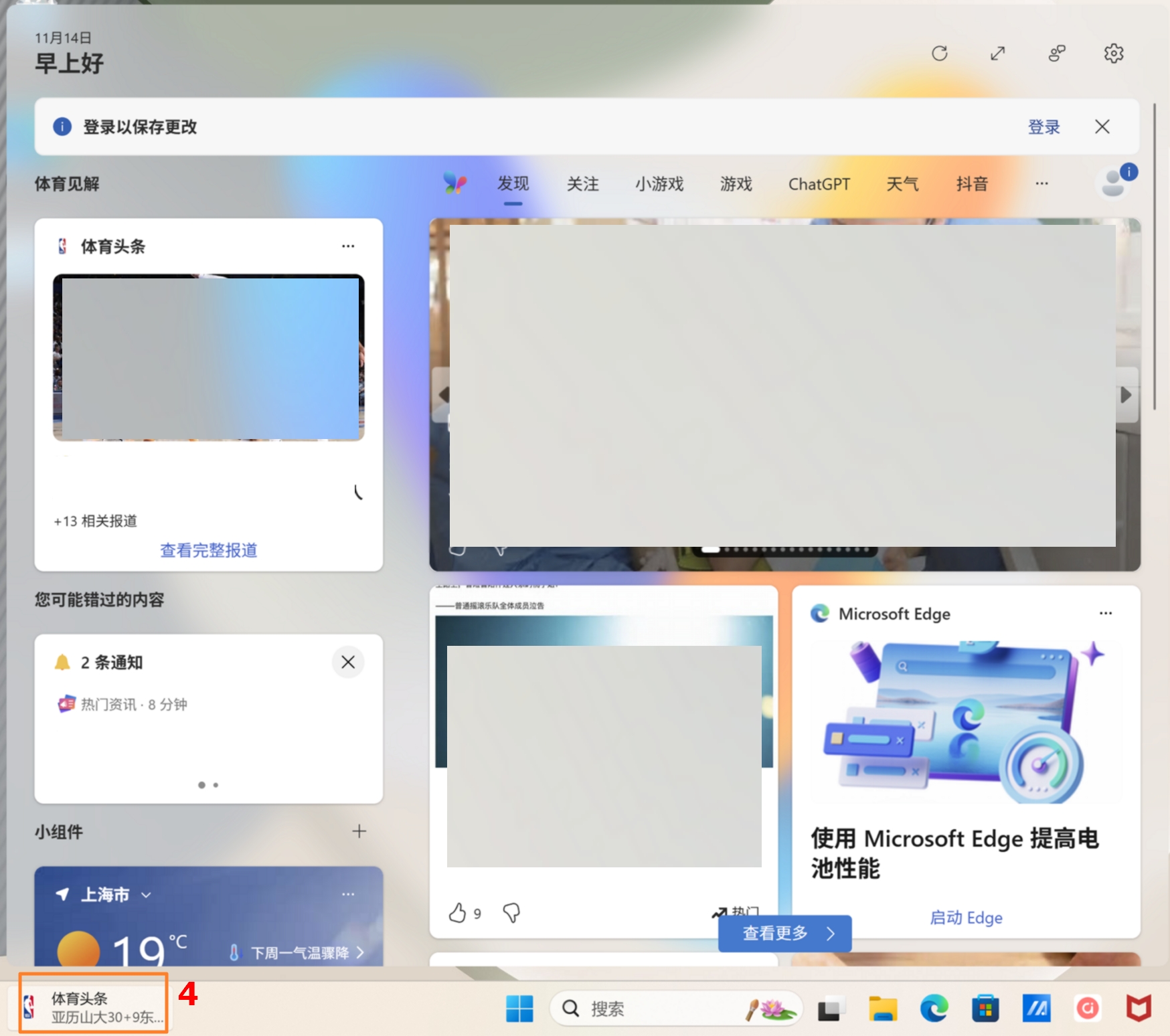 ④:透过小工具视窗,可以显示您桌面Windows资讯、汇集您最爱的App和感兴趣的新闻来源。了解更多Windows 11小工具介紹。