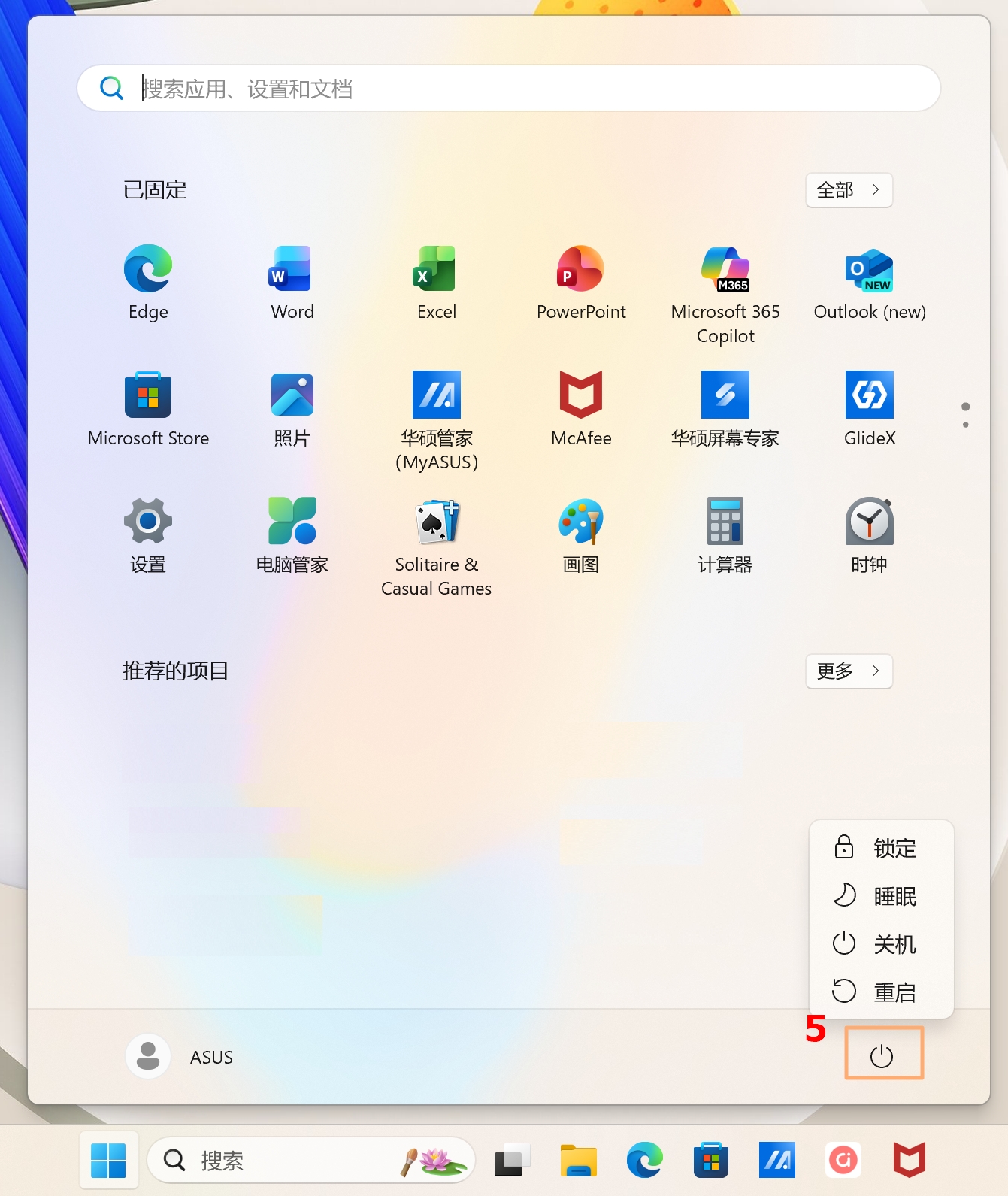 ⑤:关机、重新启动或让设备进入睡眠模式。了解更多三种关闭电脑的方式 - 关机、睡眠与休眠。