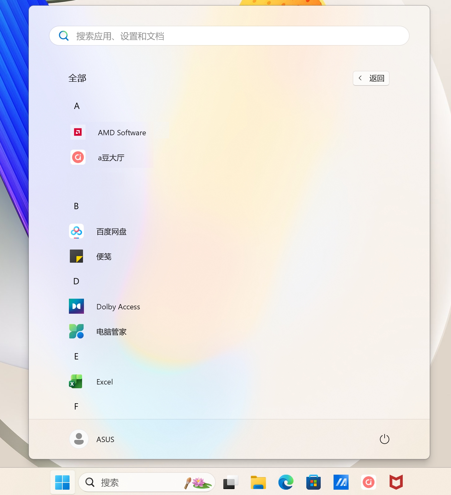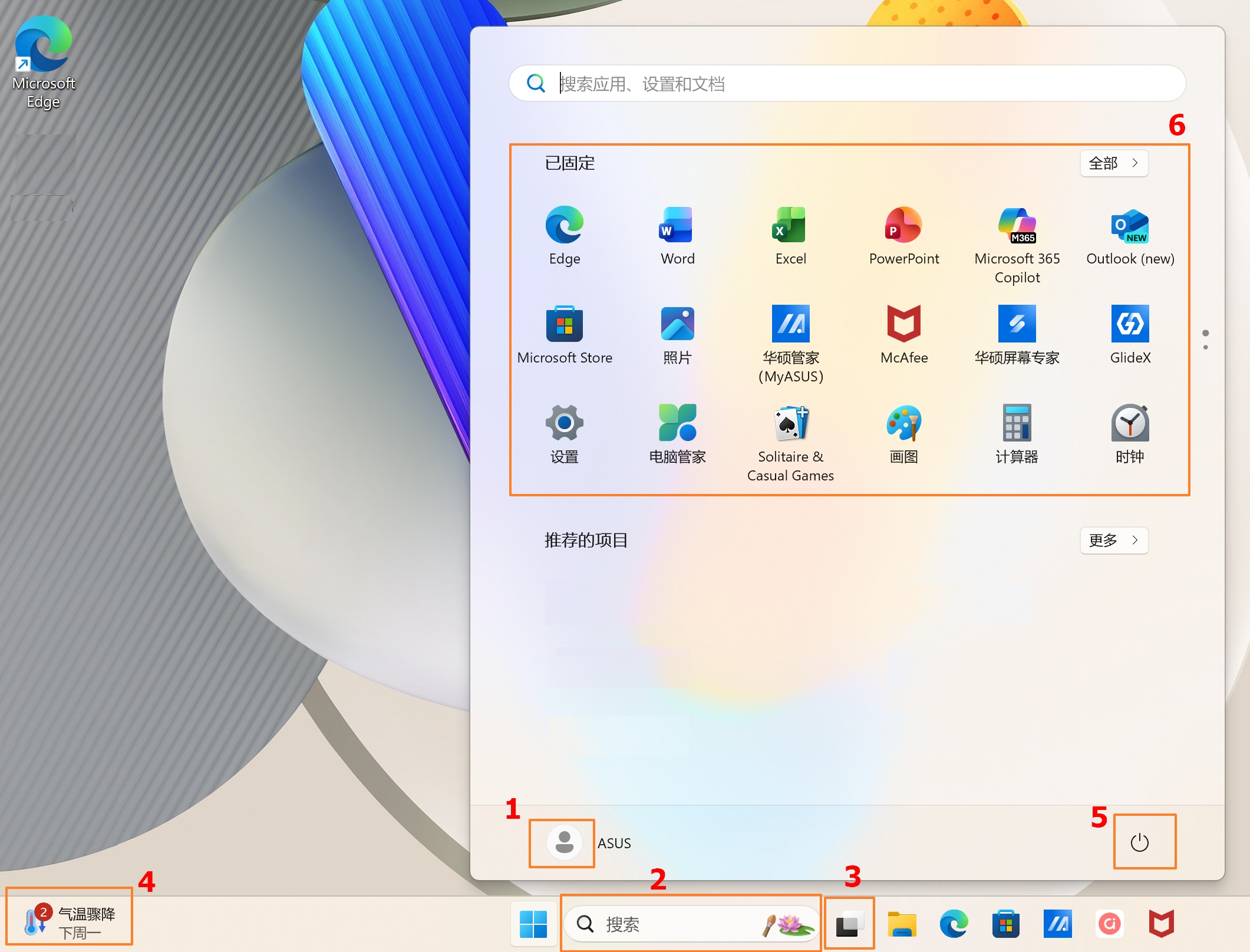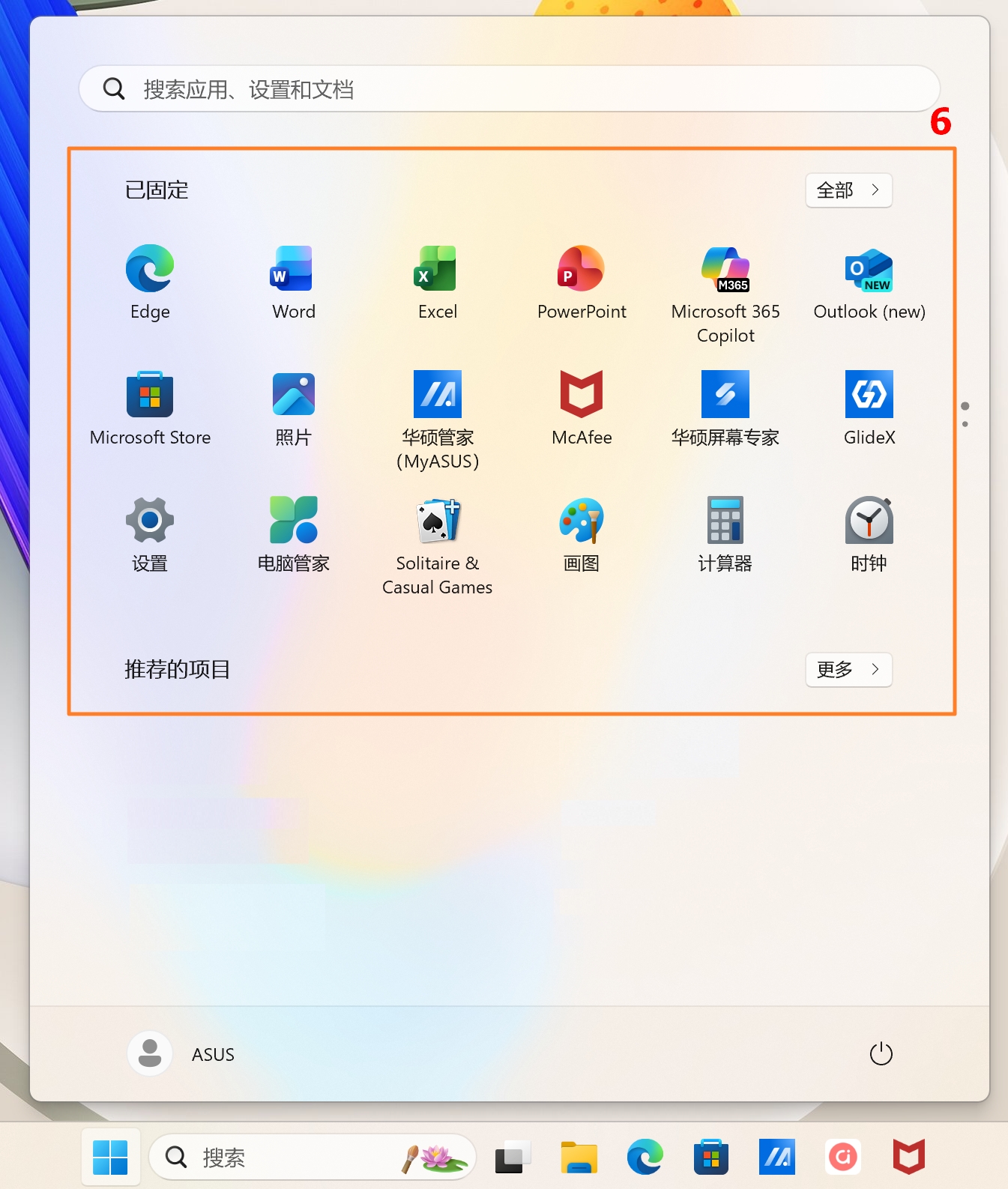 - 已固定的应用程序⑥:在开始菜单中可以看到许多固定在画面中的应用程序。