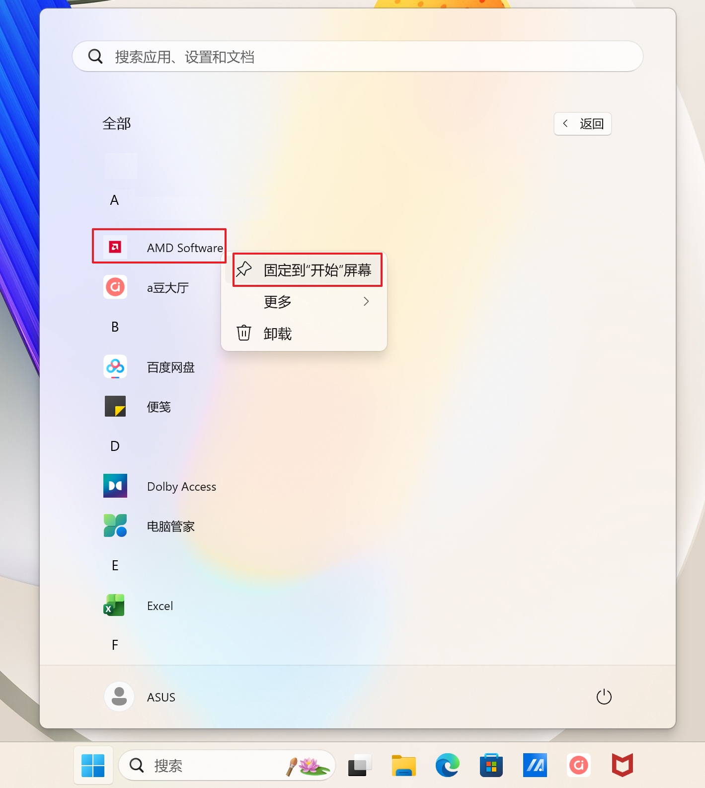 如果您想要将应用程序加入开始功能表中的已固定,您可以在所有应用程序中点击鼠标右键,然后选择固定到【开始】。