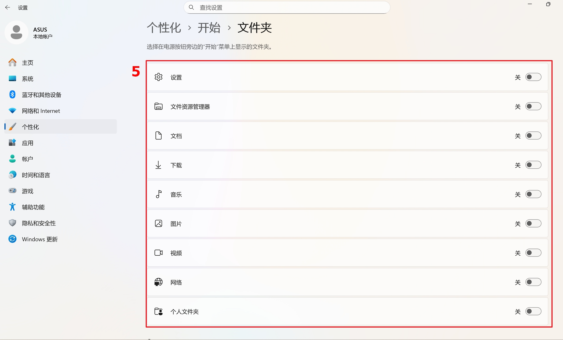 在此文件夹设置中,您可以开启/关闭要显示在电源按钮旁「开始」菜单的文件夹⑤。