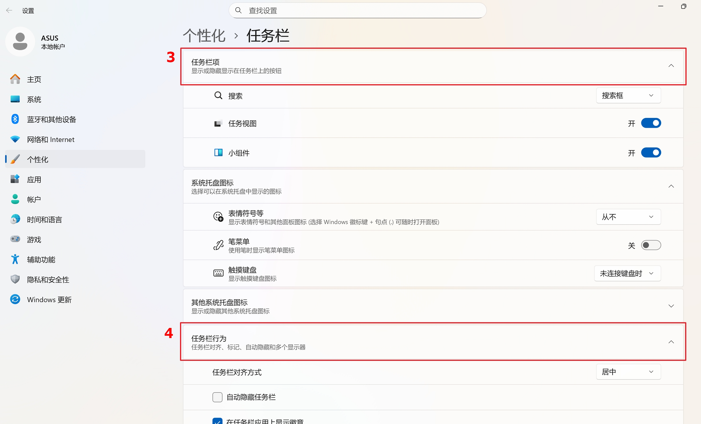 - 您可以开启/关闭在「任务栏」中想要显示的按钮③。另外您也可以点选[任务栏行为]④,以调整更多任务栏的设置。