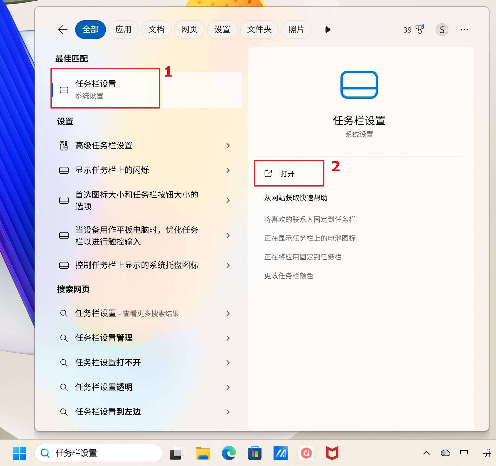 - 如果您想要针对 [任务栏] 的显示进行更改,请在Windows搜索栏输入[任务栏设置]①,然后点击[打开]②。