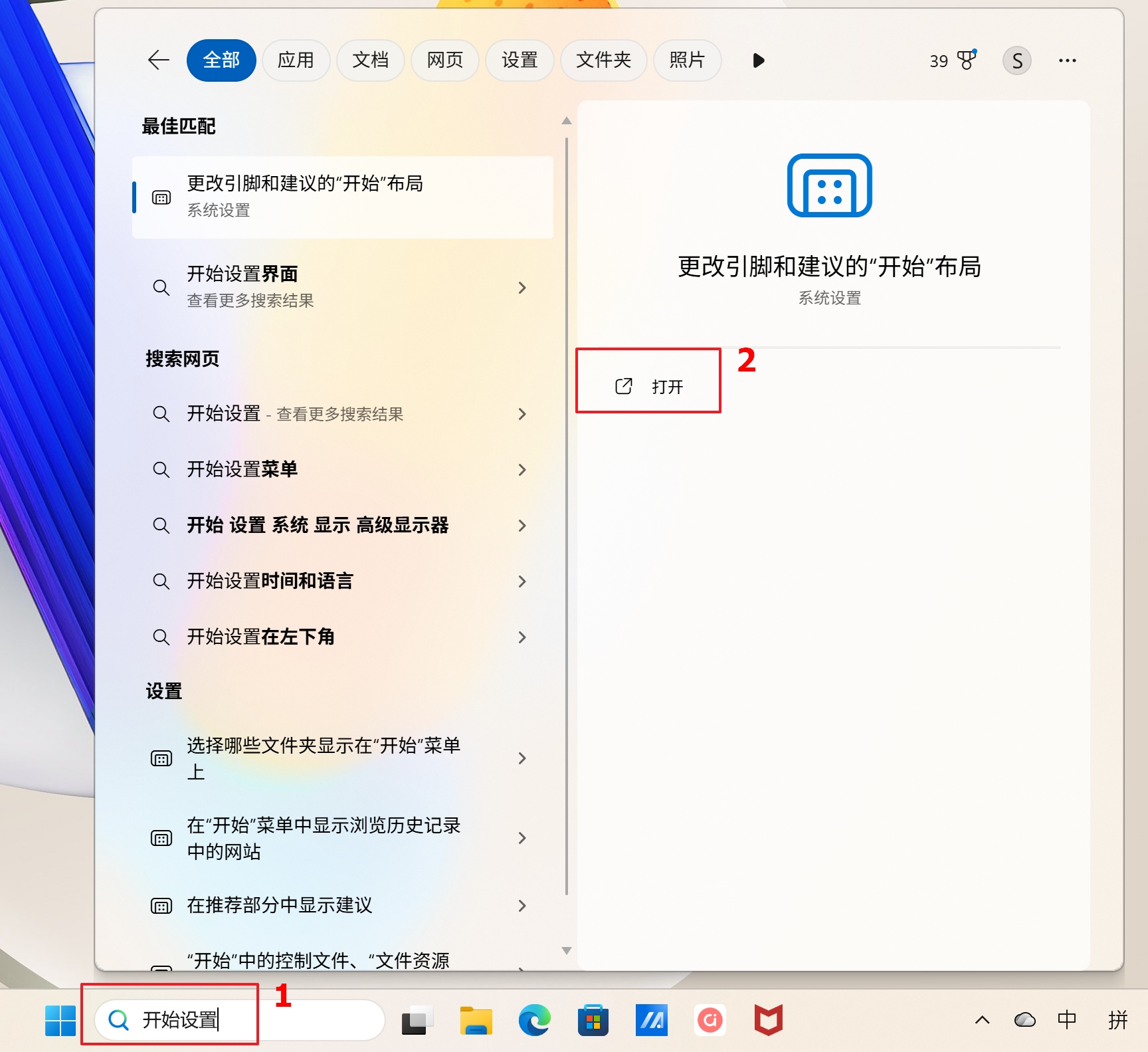 - 如果您想要针对 [开始] 菜单的显示进行变更,请在Windows搜索字段输入[开始设置]①,然后点击[打开]②。
