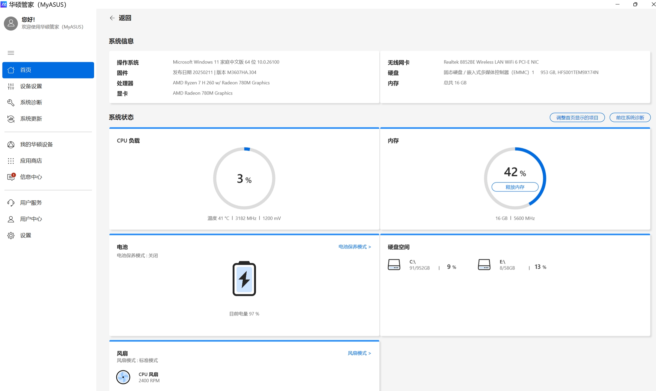 首页显示华硕管家MyASUS的主要功能,可以通过点击首页上的按钮进入相应的页面来进一步做设置和详细信息确认。