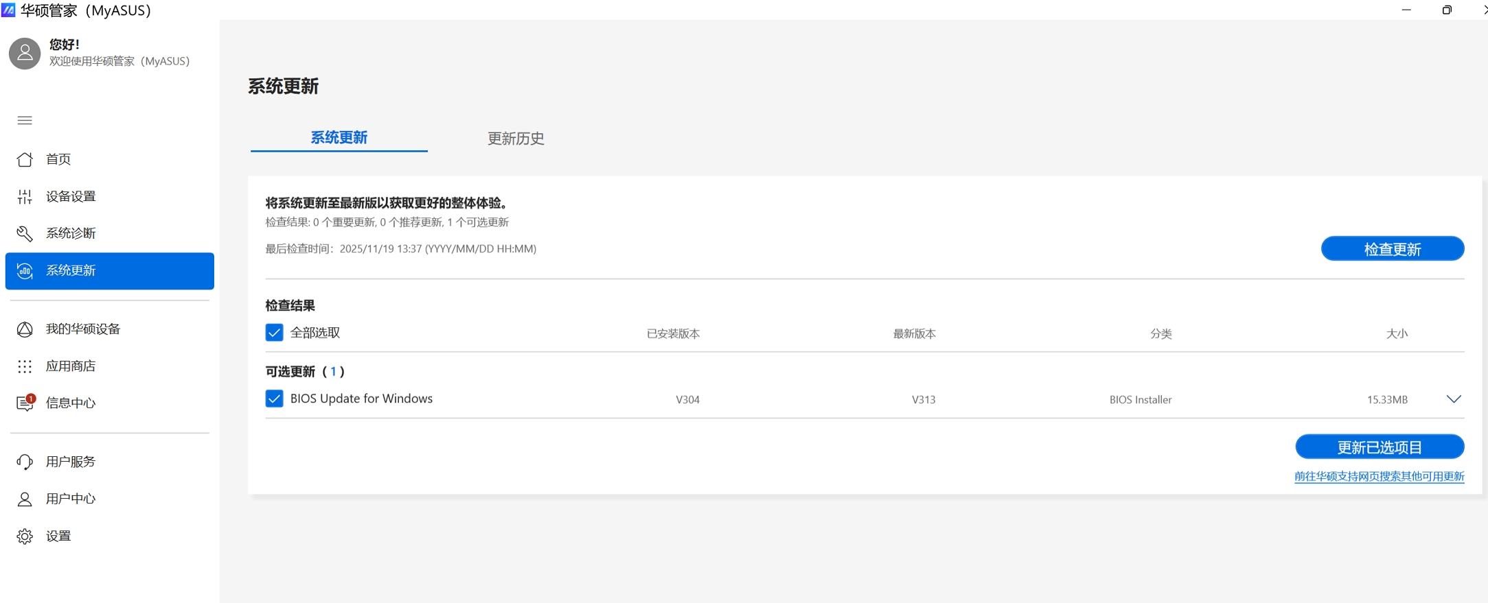 注:如果选择BIOS更新,请务必接上电源适配器供电,且更新过程中电脑将自动关机重启。