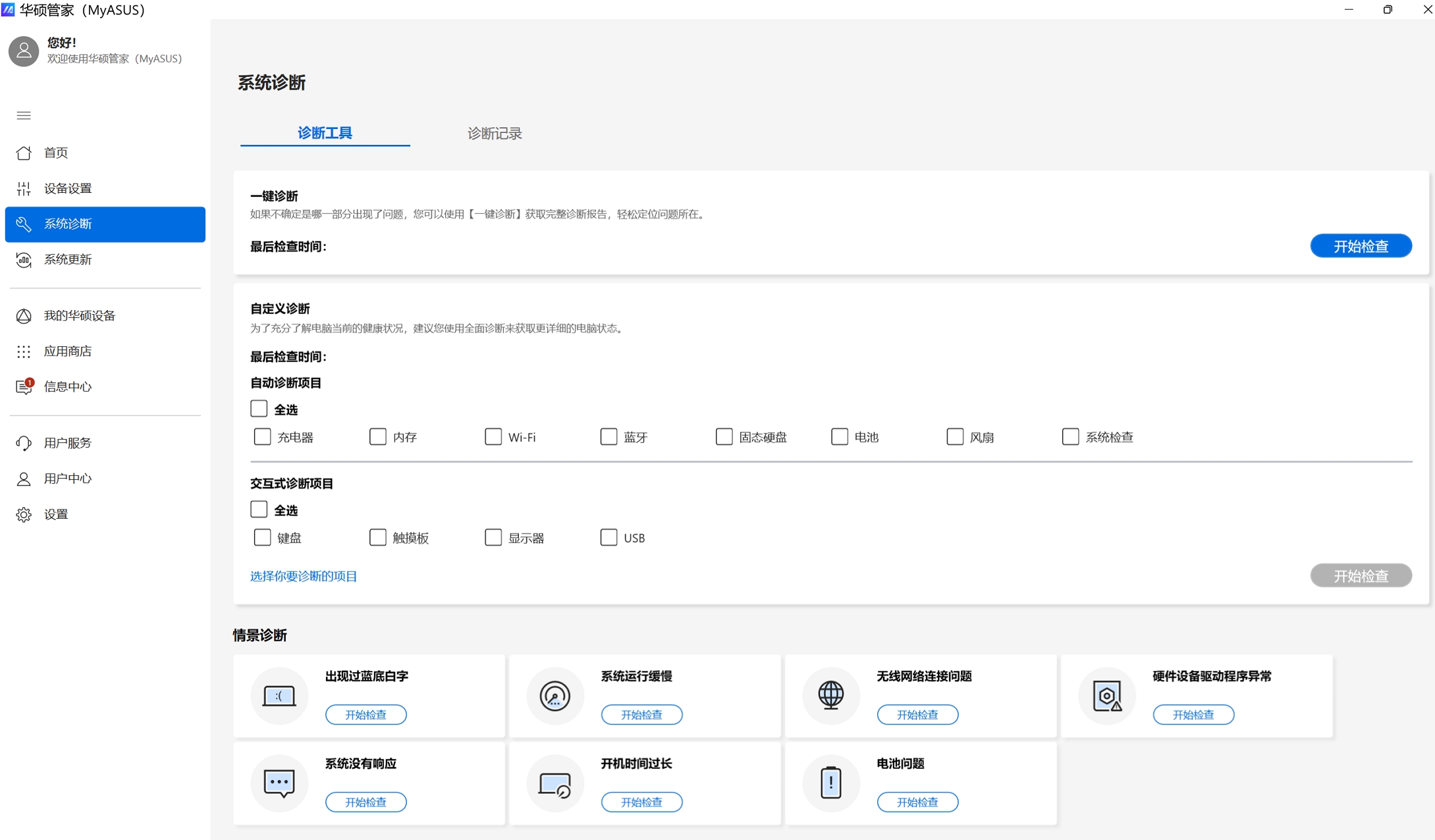 可以选择【一键诊断】,或【自定义诊断】勾选需要检查的项目,然后点选【开始检查】,也可以点选系统诊断下方任何一项问题情景诊断进行检查。