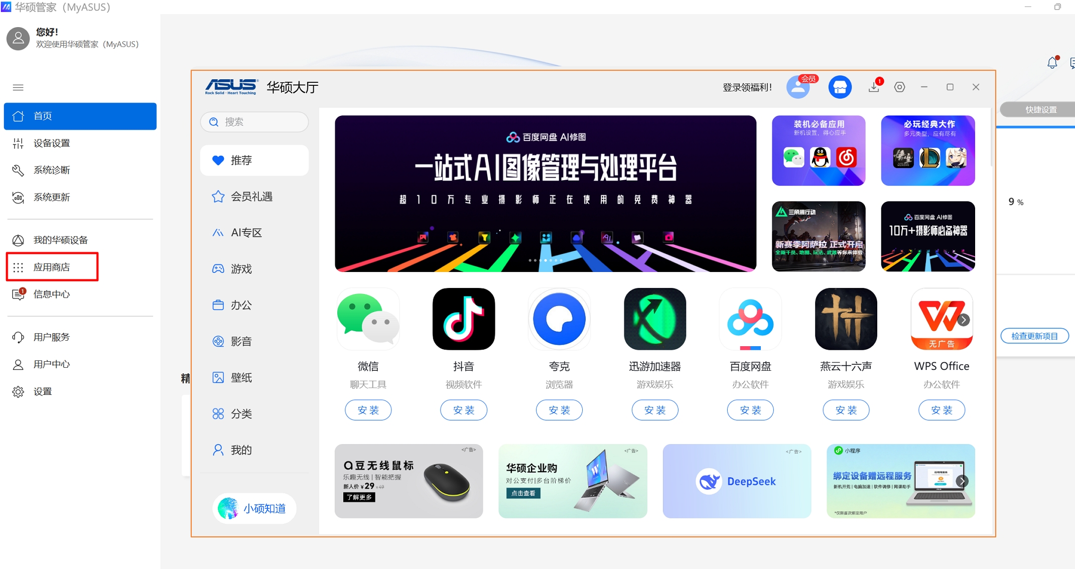 (注:电脑里面已安装华硕大厅/a豆大厅/ROG应用商店等应用的情况下将跳转打开,部分机型出厂有预装,如未安装,可通过 华硕官网 下载安装 )