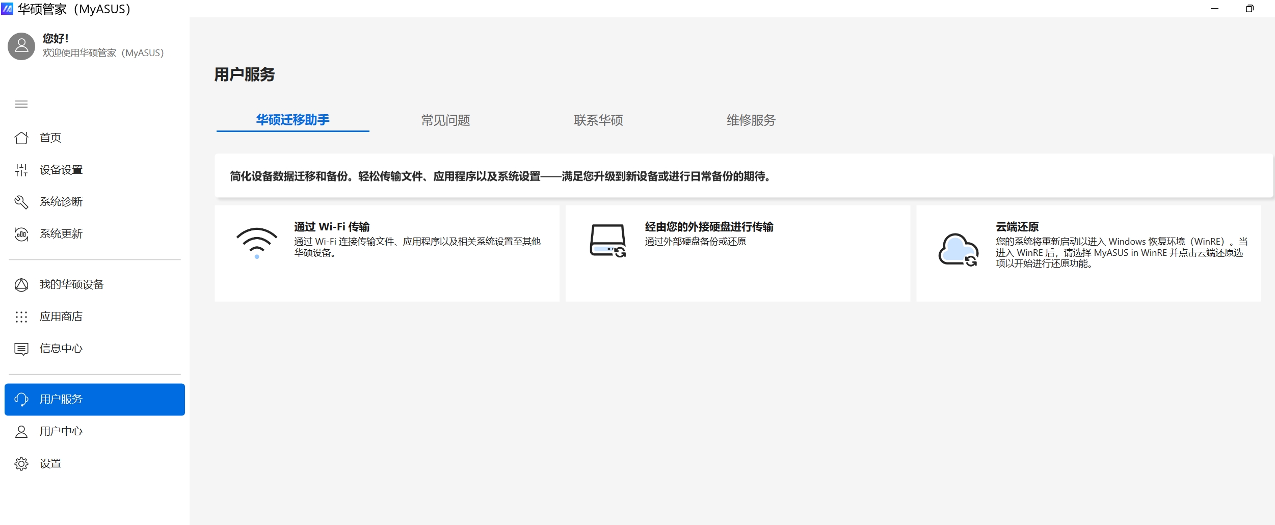 当您使用电脑遇到问题时,可以在[用户服务]中寻求协助 - 可以透过[华硕迁移助手]备份数据,通过[常见问题]自行排除故障,或[联系华硕]寻求专业人员的协助。在此页面中,您还可以经由[维修服务]查看维修状态或搜寻附近的华硕服务中心。