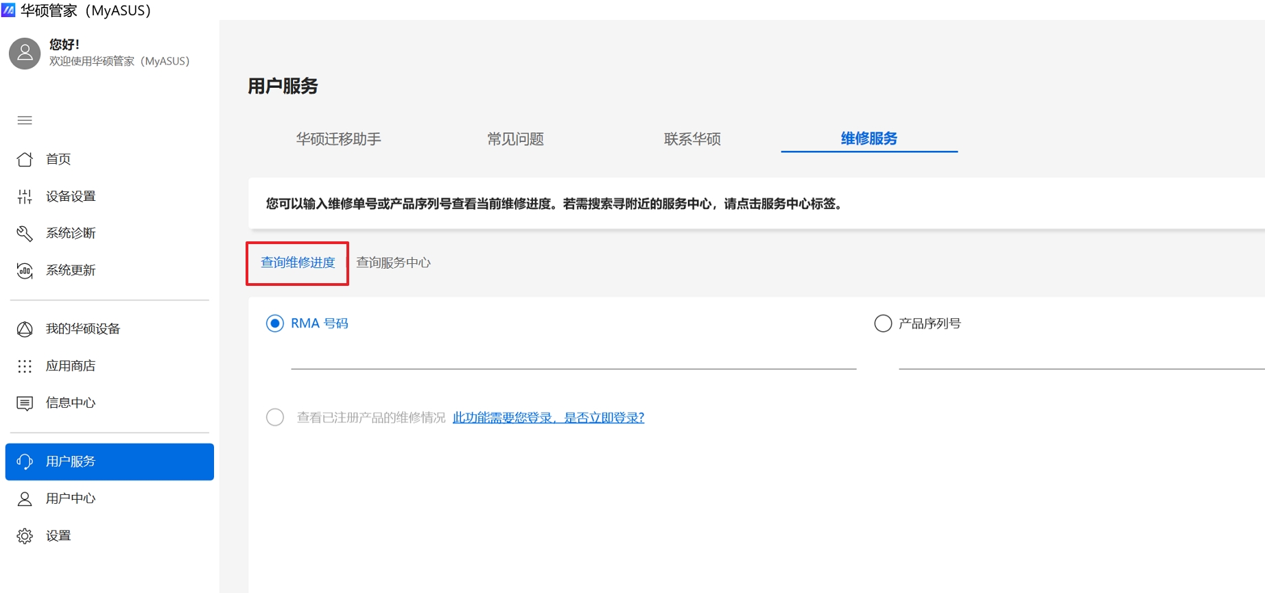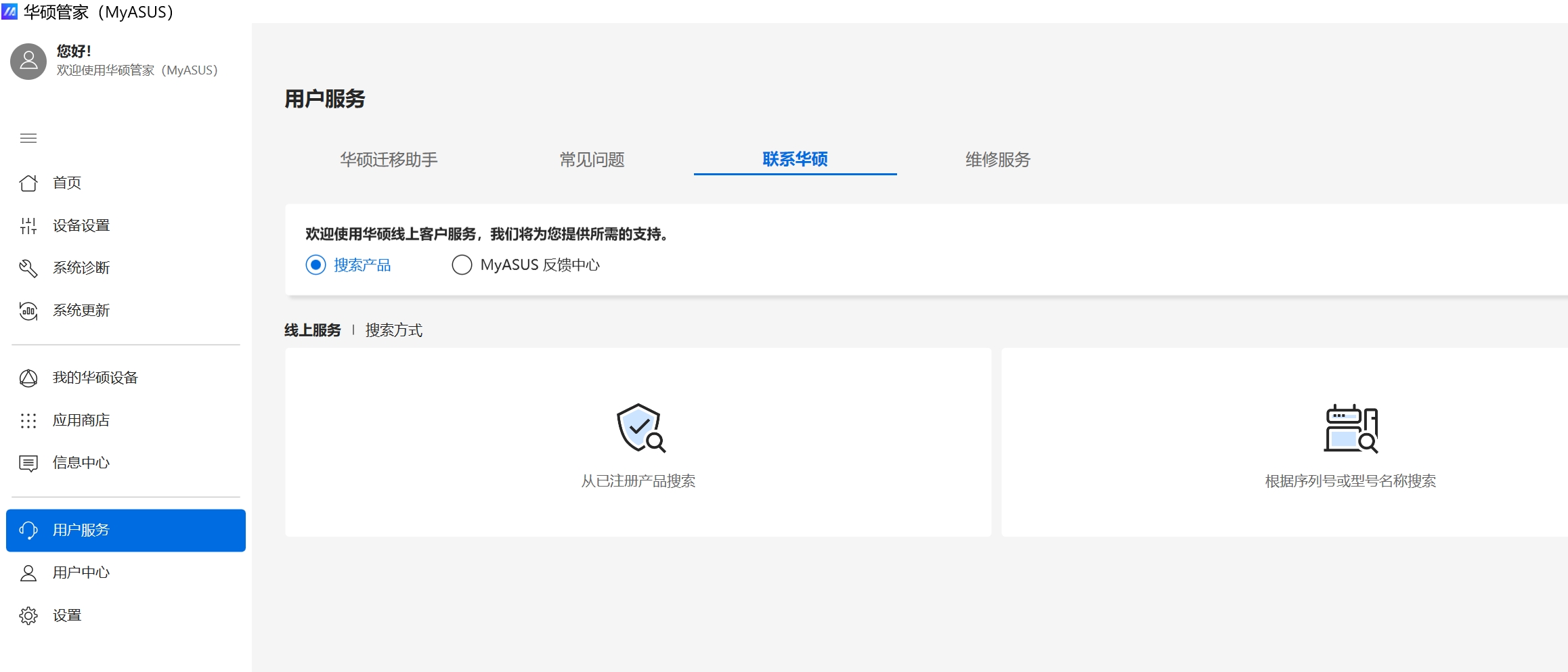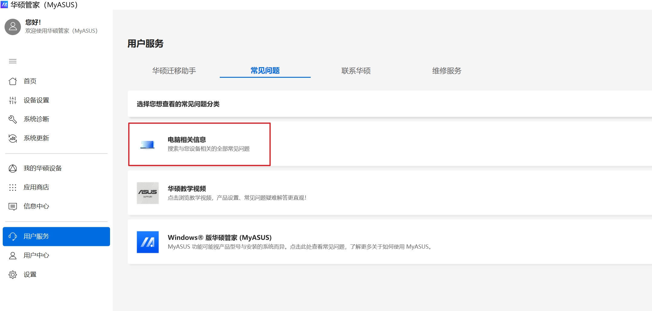 Q2: 为何我的MyASUS应用中只能看到 "用户服务 " 功能项?