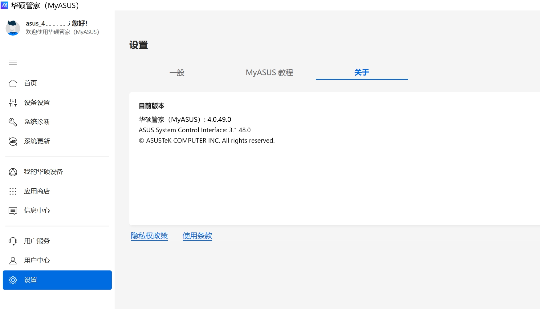 关于:可以查看华硕管家MyASUS、ASUS System Control Interface当前版本信息。