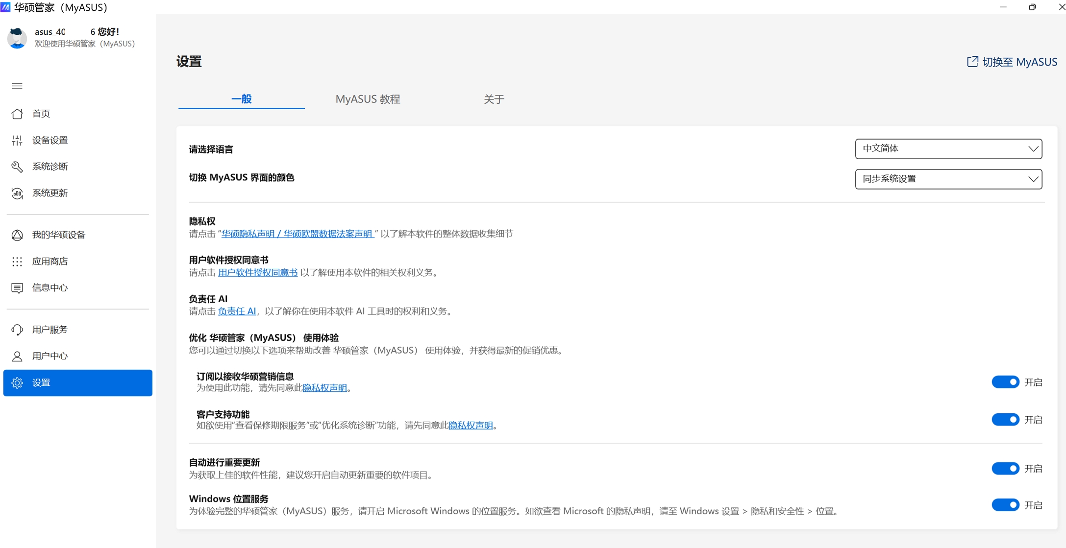 一般:提供MyASUS应用相关设置,显示语言、切换MyASUS界面的颜色、隐私权、订阅信息/客户支持/自动更新等功能的开启或关闭。